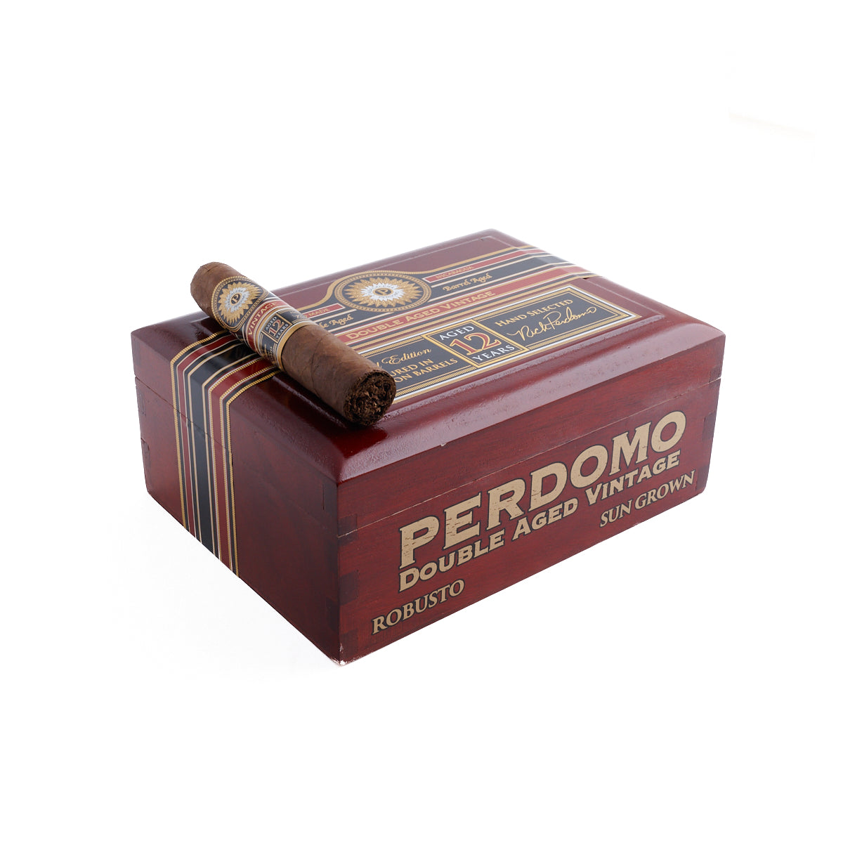 Perdomo Double Aged 12 Year Vintage Sun Grown cigars deliver a bold, complex experience rooted in meticulous aging. Each cigar features a bourbon barrel-aged Nicaraguan Sun Grown wrapper paired with Cuban-seed Nicaraguan binder and filler, all aged for 10 years in bales and an additional 2 years in charred white oak bourbon barrels.