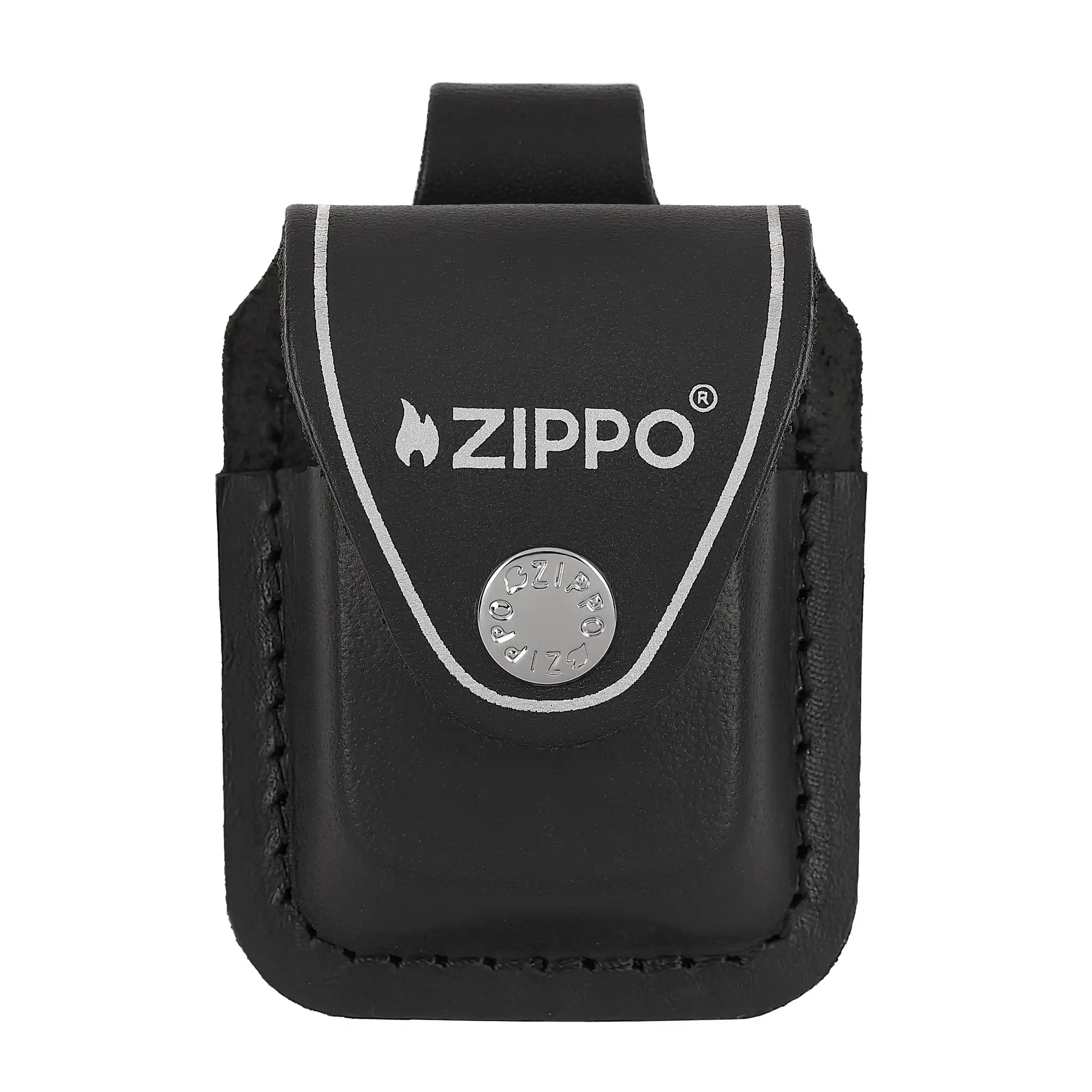 Keep your Zippo secure and always within reach with the Zippo Black Lighter Pouch. Crafted from genuine black leather with crisp contrast stitching, this pouch features the Zippo flame logo and name emblazoned in silver on the front flap, finished with a polished Zippo-branded snap closure.