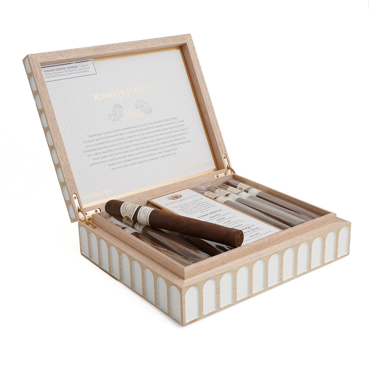 Romeo y Julieta 150th Anniversary celebrates 150 years of excellence in cigar craftsmanship. This commemorative blend features a Sumatra Ecuador wrapper, a Mexican San Andrés binder, and a unique mix of Peruvian, Honduran, and Dominican fillers. Expertly handcrafted at the Tabacalera de Garcia Factory in the Dominican Republic, this cigar delivers a complex flavor profile that evolves throughout the smoke. Expect notes of cedar, spice, chocolate, coffee, and an earthy sweetness, making it a refined and memorable smoking experience.