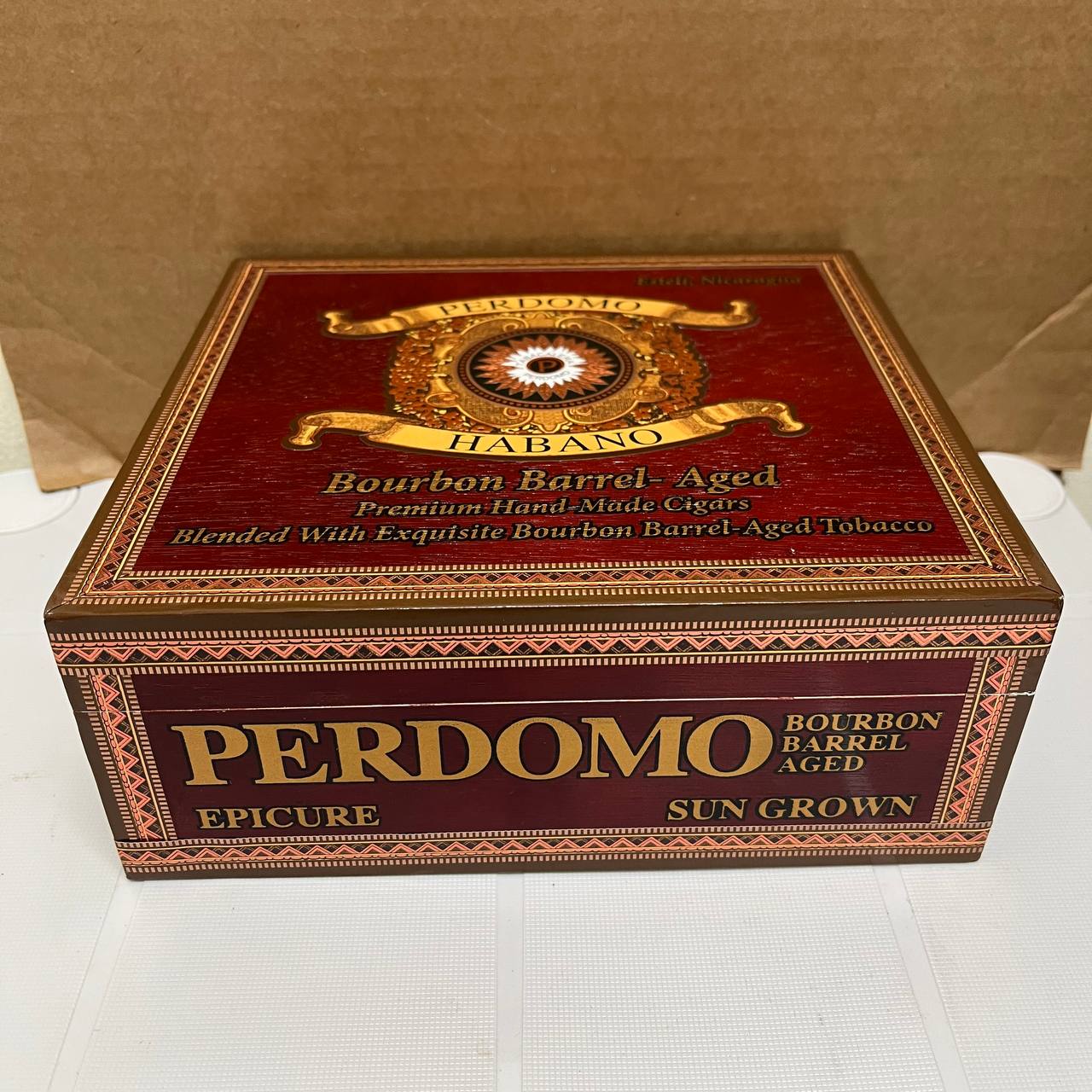 Perdomo Habano Bourbon Barrel Aged Sun Grown is a bold, medium-to-full-bodied cigar that delivers rich complexity with a smooth finish. Wrapped in a Cuban-seed Nicaraguan sun-grown leaf aged in bourbon barrels for ten months, this cigar offers notes of spice, oak, and roasted coffee. The aged wrapper enhances depth and balance, while the Nicaraguan long-fillers provide a consistent burn and satisfying draw. A perfect choice for those who enjoy robust flavor with refined character.