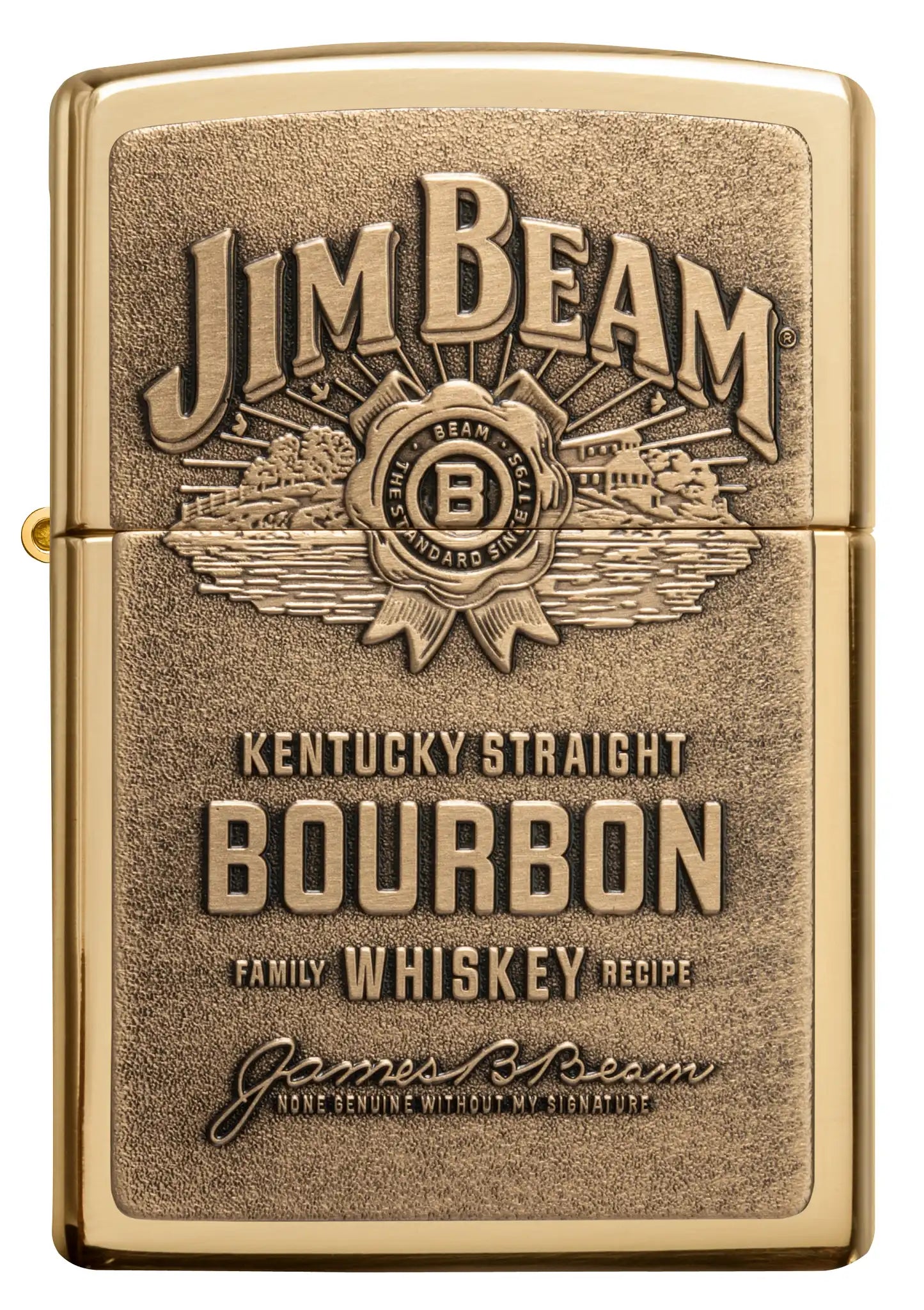 Toast to tradition with the Zippo Jim Beam® lighter. The classic Jim Beam Kentucky Straight Bourbon Whiskey label is rendered as a beautifully detailed raised brass emblem on this High Polish Brass case — featuring the iconic “B” medallion, the founding family's signature of James B. Beam, and the full “Family Recipe” label text in three-dimensional relief.