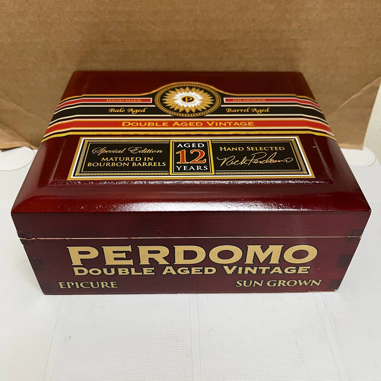 Product Information & SpecificationsPerdomo Double Aged 12 Year Vintage Sun Grown cigars deliver a bold, complex experience rooted in meticulous aging. Each cigar features a bourbon barrel-aged Nicaraguan Sun Grown wrapper paired with Cuban-seed Nicaraguan binder and filler, all aged for 10 years in bales and an additional 2 years in charred white oak bourbon barrels.