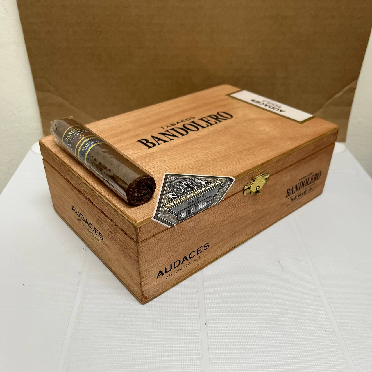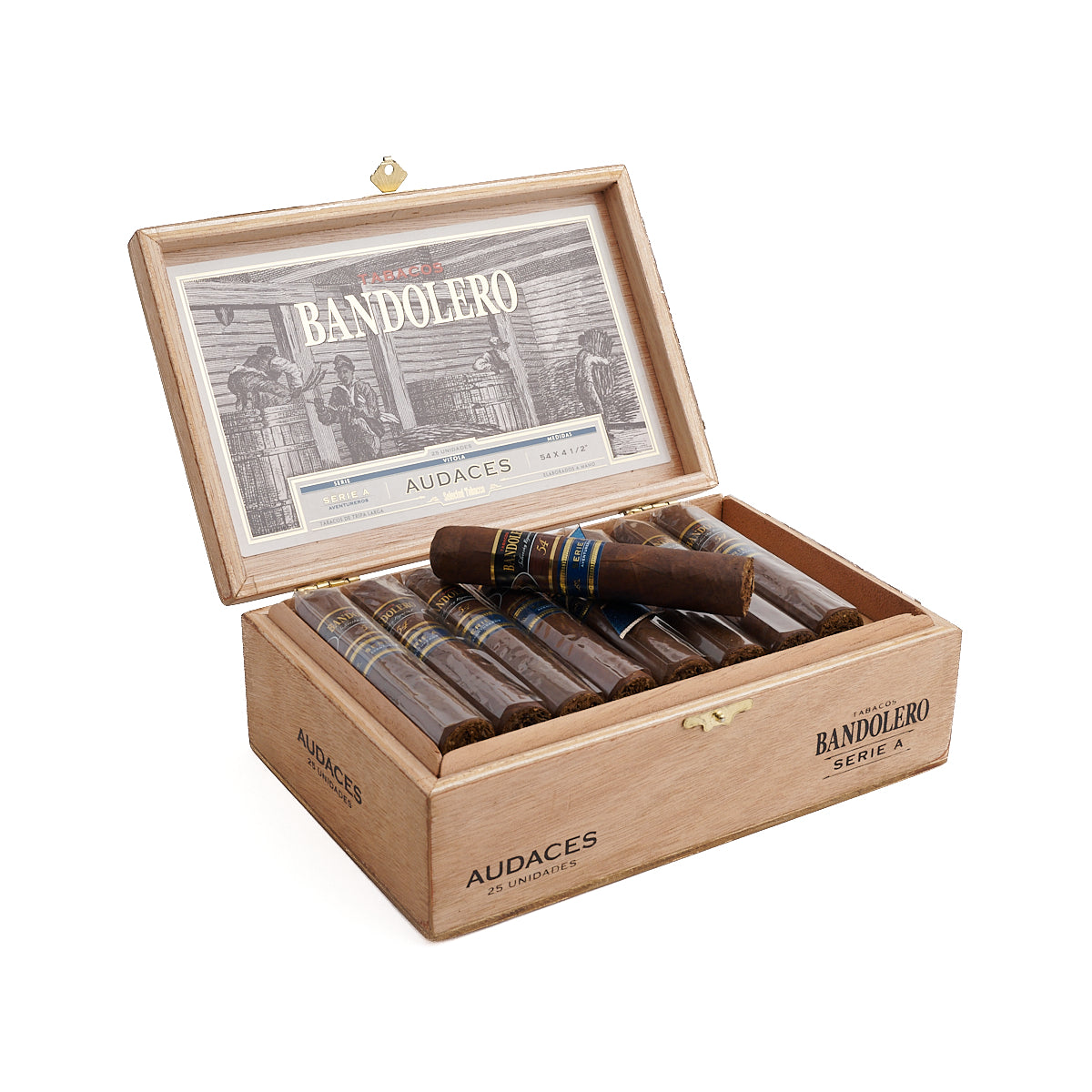 Bandolero Audaces Robusto (4.5" x 54) is a medium-bodied cigar that blends mystery with mastery. Crafted in Costa Rica, this short robusto features a dark Ecuadorian wrapper with a slightly oily sheen, encasing a secret-origin binder and a mix of Peruvian and undisclosed filler tobaccos. The result? A smooth yet bold smoke with notes of cocoa, leather, spice, and sweet oak, complemented by a creamy finish and a hint of espresso on the retrohale. Its impeccable construction ensures an even burn and a satisfying draw from start to nub—perfect for aficionados who appreciate complexity in a compact format.