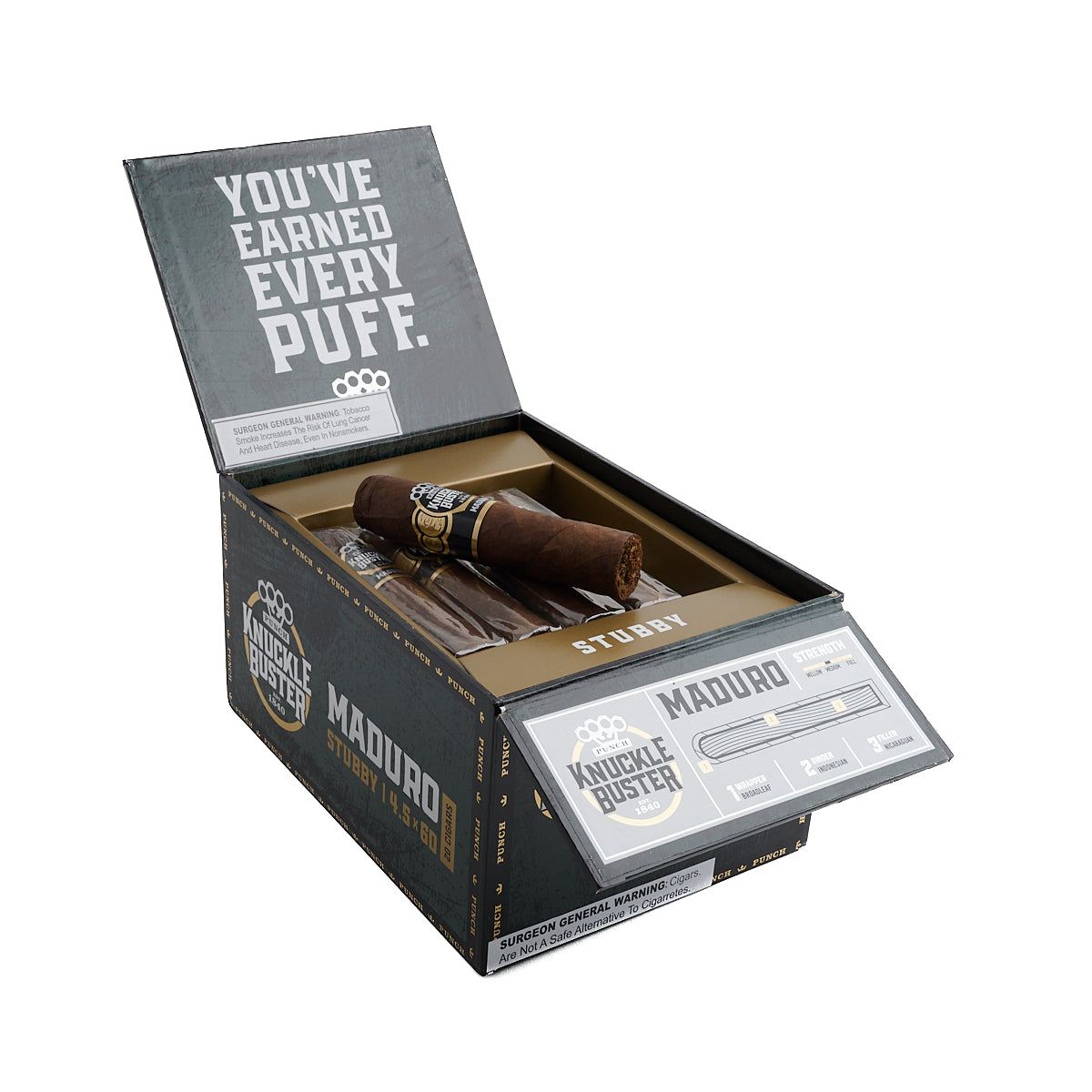 Punch Knuckle Buster Maduro is a no-nonsense, full-flavored cigar built for those who like their smokes bold and unapologetic. Wrapped in a dark, oily Connecticut Broadleaf Maduro, this cigar delivers a rich, complex profile of molasses, nuts, cocoa, and black cherry, with a peppery kick that keeps your palate on its toes. Inside, a hearty blend of Nicaraguan fillers and an Indonesian binder provide a smooth yet robust backbone that burns evenly and finishes strong. Handmade in Honduras, it’s a wallet-friendly knockout that punches well above its price point. Whether you're winding down after work or pairing it with bourbon on the weekend, this cigar is built to satisfy.