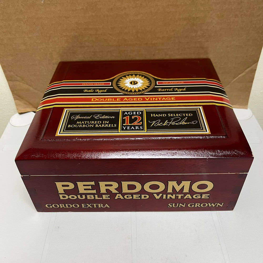 Perdomo Double Aged Vintage cigar with a box on a white surface
