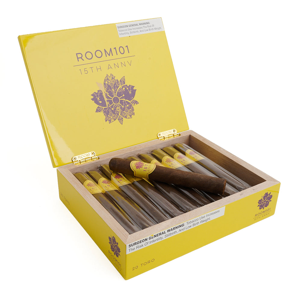 Product Information & SpecificationsRoom 101 15th Anniversary Toro is a limited-edition cigar crafted to celebrate 15 years of Room 101's legacy. This Nicaraguan puro is handmade at the AJ Fernandez factory, featuring a medium-bodied blend of premium Nicaraguan tobaccos. Measuring 6 inches in length with a 52-ring gauge, it offers a balanced smoking experience with sweet and spicy tasting notes. Packaged in vibrant yellow and purple boxes of 20, this commemorative cigar is a testament to Room 101's dedication to quality and innovation.