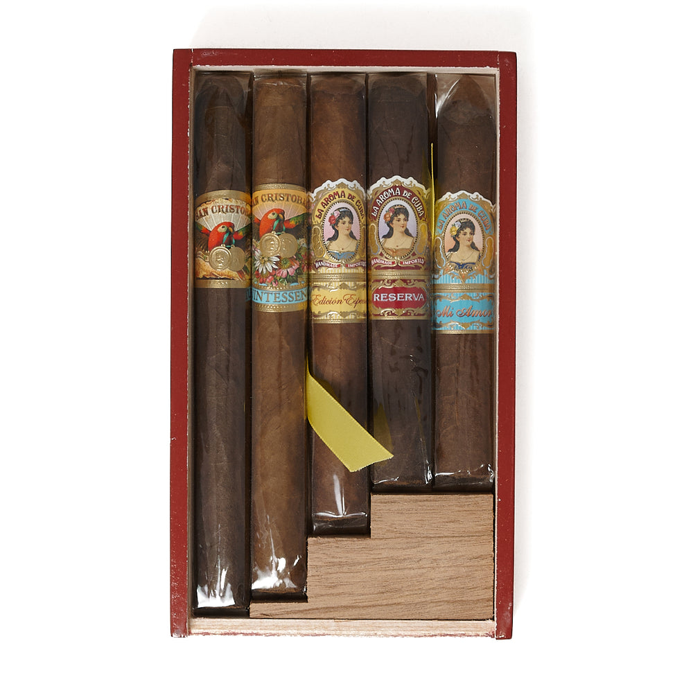 产品信息和规格The 95-rated La Aroma de Cuba Mi Amor joins the 94-rated La Aroma de Cuba Reserva and 94-rated La Aroma de Cuba Edición Especial with a pair of luscious San Cristobal profiles, including the 93-rated original San Cristobal and 95-rated San Cristobal Quintessence. Tasting notes of cedar, hickory, dark chocolate, molasses, and black pepper mingle with classic Nicaraguan spices.