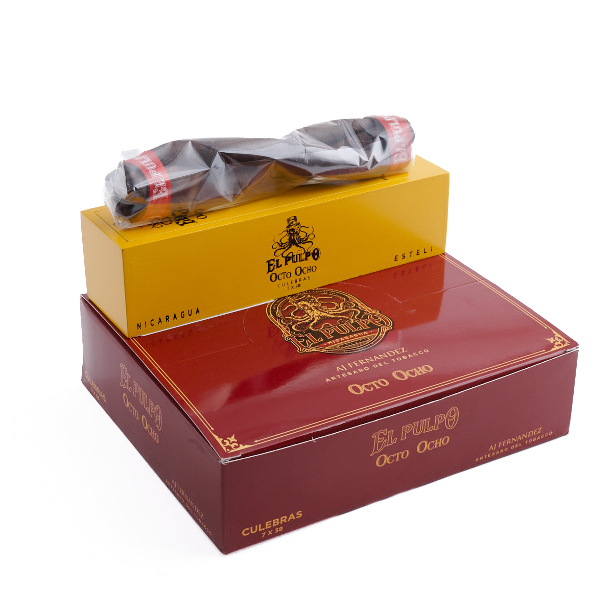 El Pulpo Octo Ocho Culebra is a visual and sensory masterpiece from Artesano Del Tobacco, handcrafted at AJ Fernandez’s San Lotano factory in Nicaragua. This full-bodied cigar features a Mexican San Andrés maduro wrapper over Nicaraguan binder and fillers, delivering a bold, earthy profile with notes of cocoa, spice, and dark chocolate. The Octo Ocho vitola is a true culebra—three 7 x 38 long panatelas twisted together like entwined serpents, then nestled in a wooden coffin. Each cigar is meant to be smoked individually, offering a rich, complex experience with every draw. Symbolic, rare, and unforgettable, El Pulpo Octo Ocho is ideal for collectors and connoisseurs who crave artistry and intensity in equal measure.